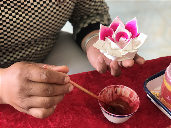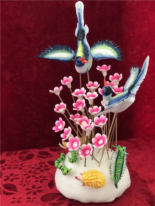 一坨坨白花花的面在经过奶奶的巧手随便一捏,就变成了一朵朵形态逼真的大丽花、小鸟、小鱼……再染上从黑枸杞、鸡冠花、豆叶等天然植物中提取的颜色,活灵活现得就跟真的一样。郭刚回忆起初对面塑感兴趣的儿时场景,当时的他还只是个三年级的小学生。