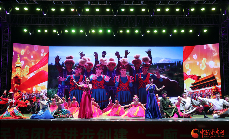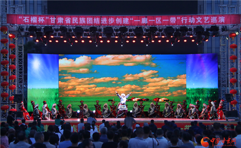 中国甘肃网7月21日讯(本网记者 程健 文/图)“中华吉祥果,兄弟姐妹多,守望相助知冷热,心手相牵同圆梦……”7月20日晚,由甘肃省民族事务委员会联合中共金昌市委、市人民政府主办,金昌市民宗委、甘肃省民族歌舞团承办的“‘石榴杯’甘肃省民族团结进步创建‘一廊一区一带’行动文艺巡演——石榴花开映陇原”在金昌市人民文化广场倾情上演,为金昌市各族群众奉献了一场丰盛的民族歌舞盛宴。
