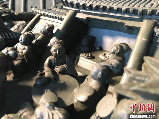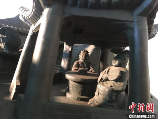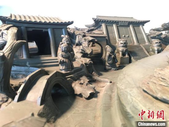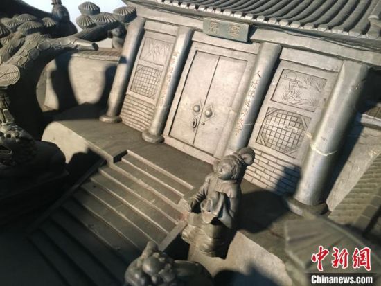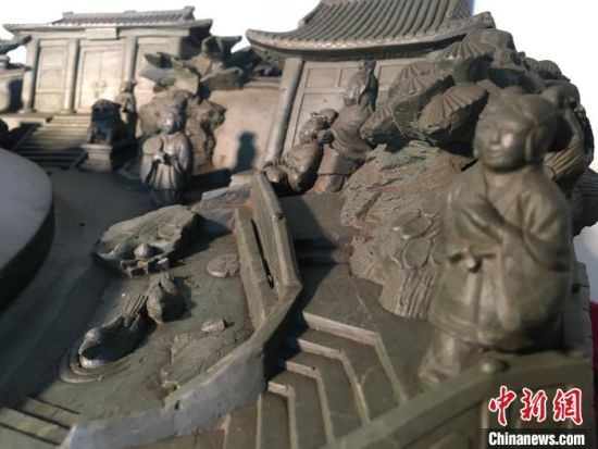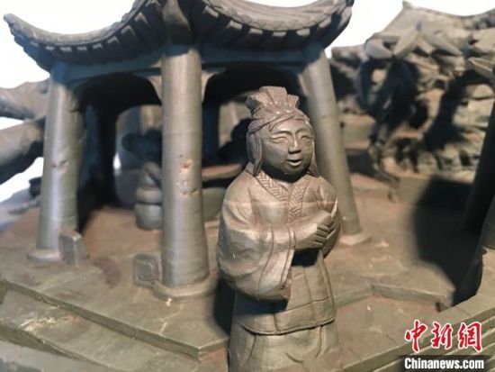 近日,在素有“中国洮砚之乡”美誉的甘肃岷县,48岁洮砚艺人徐哲展示重达1吨的《红楼梦砚》,该作品由5名洮砚艺人,历时7个多月,将原石进行雕刻、打磨、抛光等10余道工序,选取《红楼梦》中宝玉摔玉、刘姥姥进大观园、黛玉葬花等故事情节,精妙雕刻而成。张婧 摄