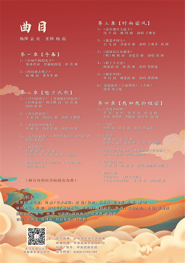“中央民族乐团文化帮扶慰问演出《国风新潮》分为‘序幕’‘魅力民歌’‘时尚国风’‘我和我的祖国’四个篇章。”中央民族乐团演出部主任耿靓在接受掌上兰州·兰州晨报记者采访时说,“此次赴甘肃文化帮扶慰问演出是中央民族乐团多年来坚持贯彻党中央的号召“深入生活、扎根人民”的重要举措,也是今年乐团文化扶贫的工作部署之一。这次我们特别选取了祖国各地不同民族、不同风格的民族声乐和器乐作品,着力为大家展现新时代的大舞台上,多姿多彩的民族音乐文化风貌,助力脱贫攻坚,与广大甘肃百姓共同唱响全面决胜小康的胜利凯歌。”