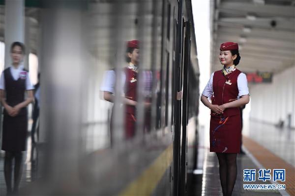 一名列车员在兰州—张掖—嘉峪关—敦煌旅游专列旁立岗做开行前准备。(资料图) 新华社记者 陈斌 摄