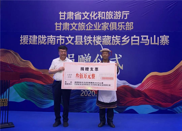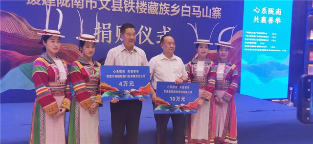 9月2日下午,甘肃省文旅厅与甘肃文旅企业家俱乐部援建陇南市文县铁楼藏族乡白马山寨捐赠仪式在兰州举行。省文化和旅游厅党组书记、厅长陈卫中出席仪式并讲话,省红十字会党组成员、专职副会长任进全出席仪式并作表态讲话,省文旅厅党组成员、副厅长万学科主持仪式。甘肃城乡发展投资集团董事长王明寿、甘肃文旅产业集团总经理杨宇宏出席仪式,甘肃文旅企业家俱乐部理事长柴林介绍了白马山寨受灾情况,汇报了恢复重建计划。甘肃文旅企业家俱乐部主席、甘肃天庆集团董事长韩庆向文县县委常委、统战部部长曹斌转交了300万元捐款。之后,受捐村寨群众代表用白马藏族歌声表达了对党和政府及企业家的感激之情。