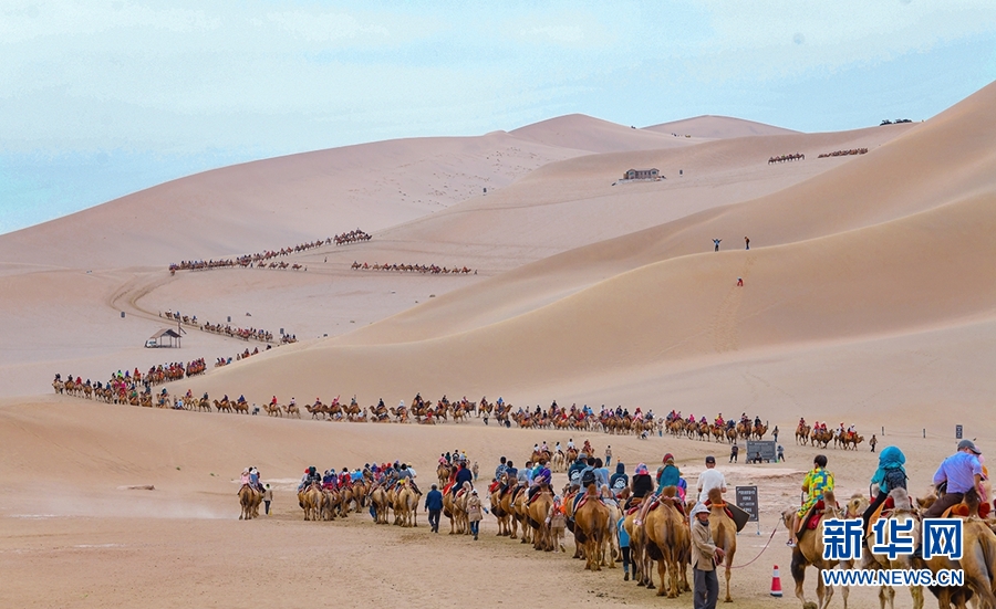 鸣沙山上蜿蜒的驼队。新华网发(杨艺锴 摄)