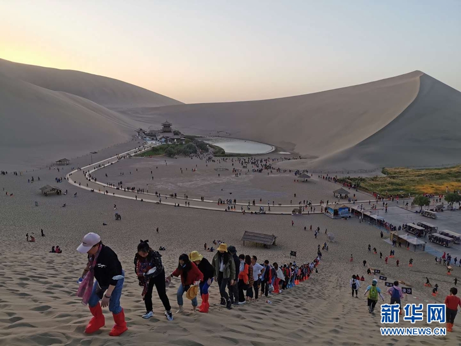 游客在攀爬鸣沙山。新华网发(黄文新 摄)