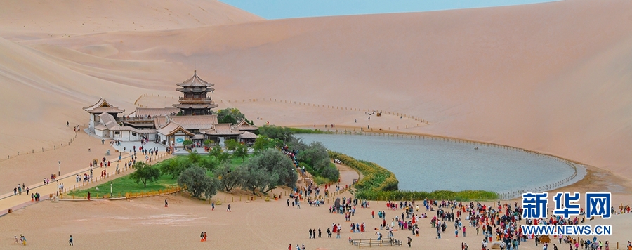游客在月牙泉边游玩。新华网发(杨艺锴 摄)