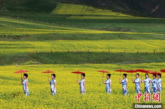 图为游客在甘肃张掖市民乐县扁都口油菜花海观光游览。(资料图) 张渊 摄