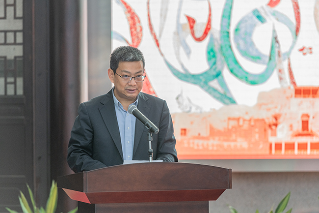 敦煌研究院院长赵声良在仪式上致辞。他说,敦煌与海南,分别位于陆上和海上丝绸之路要冲,共同见证了古代中外文化交流的历史。今年8月,敦煌研究院与海南省博物馆联合在敦煌莫高窟成功举办的“涨海推舟•千帆竞渡——南海水下文化遗产大展”产生了巨大反响。此次在海南举办敦煌艺术展,将进一步让广大观众充分了解陆上和海上丝绸之路的盛况,更加深入地领会“一带一路”的文化意义,进一步弘扬“和平合作、开放包容、互学互鉴、互利共赢”丝路精神,同时也为传承和发扬中华优秀传统文化,讲好中国故事作出积极的贡献。