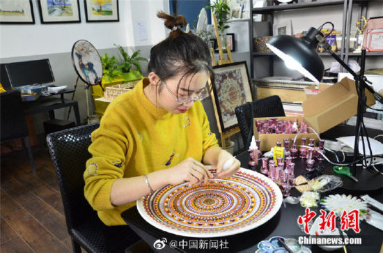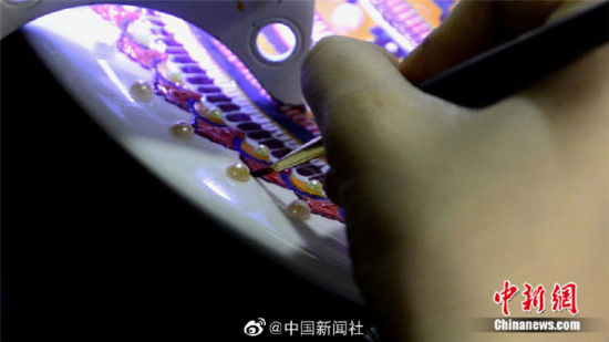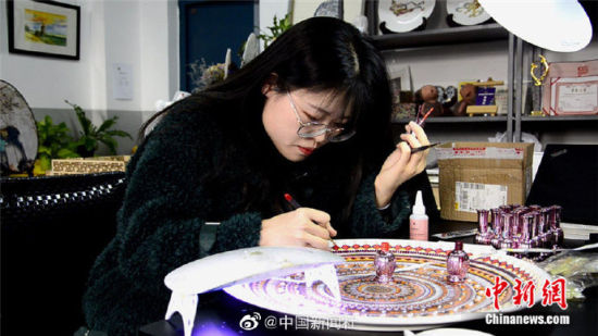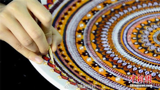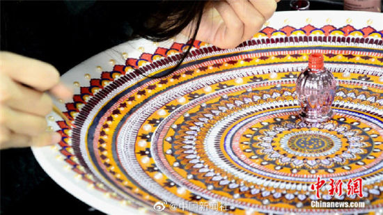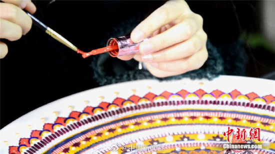 敦煌彩绘工艺盘是提取敦煌藻井纹样,利用陶瓷玻璃脆的绘制工艺,最初用丙烯颜料绘制,但价格便宜的原料色彩不够鲜亮,后来探索用指甲油、甲油胶代替,色彩即刻鲜艳起来。“看到敦煌彩绘盘才发现,指甲油涂手真的太浪费!”学生们惊叹道。(记者 李亚龙)