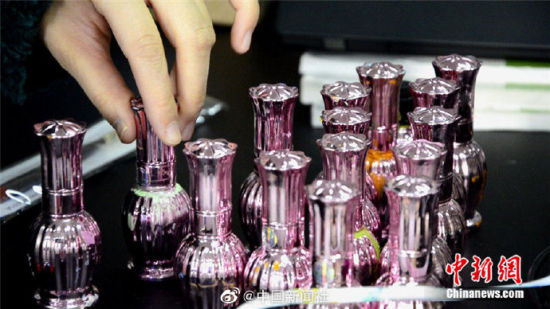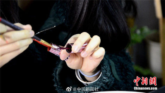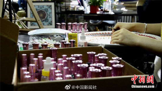 美甲光疗机散发着蓝色的光束,一位女生正在从数十瓶不同的甲油胶挑选颜色,另一位女生正在粘贴美甲钻饰……乍以为进入了美甲店,其实这只是兰州交通大学一堂敦煌彩绘工艺盘制作课。