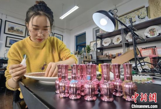 中新网兰州1月14日电 (记者 刘玉桃)“指甲油涂手上太浪费,留着涂盘子。”兰州交通大学艺术设计学院研究生寇梓熙一边制作敦煌彩绘工艺盘,一边说:“平日里,为了臭美,买了很多指甲油,却没想到用它作画,也别有一番风味。”