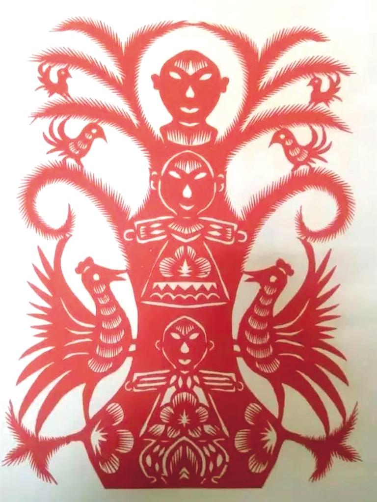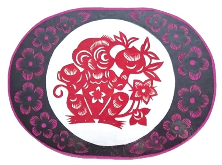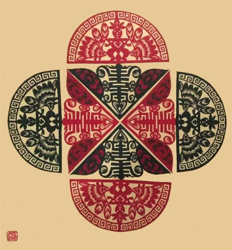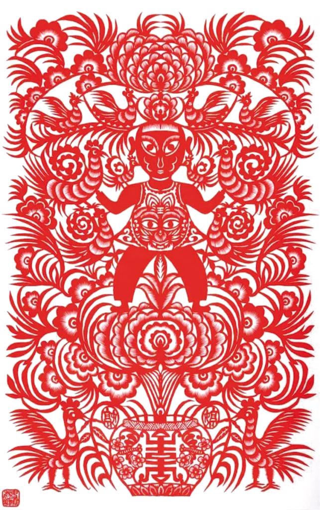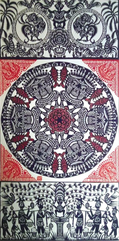 在她其中一幅作品里,传统图腾或是一些象征美好寓意的剪纸元素,都是在遵循原始状态的基础上,重新进行了组合、创新之后完成的,与之前的单幅剪纸作品相比,更具气势,也更完整。