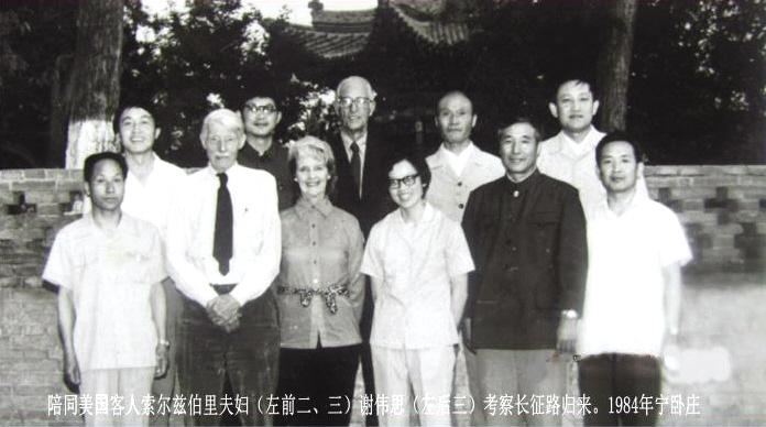 1984年陪同美国客人索尔兹伯里夫妇(左前二、三)、谢伟思(左后三)考察长征路归来。
