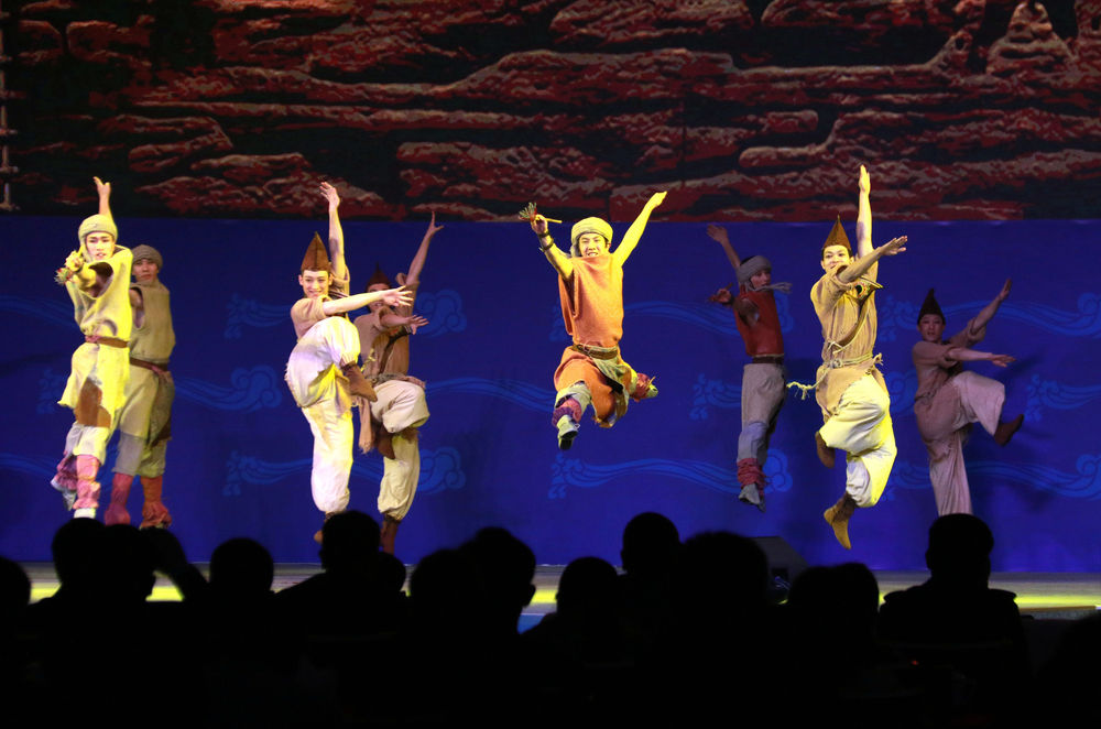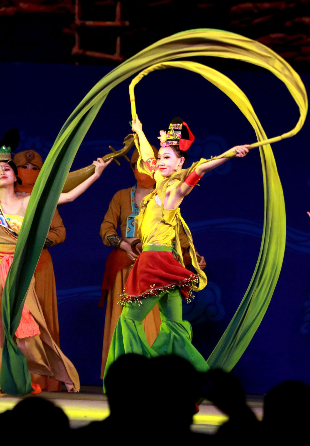 4月9日,演员在文艺演出《敦煌之韵》中表演舞蹈《丝路集市》。