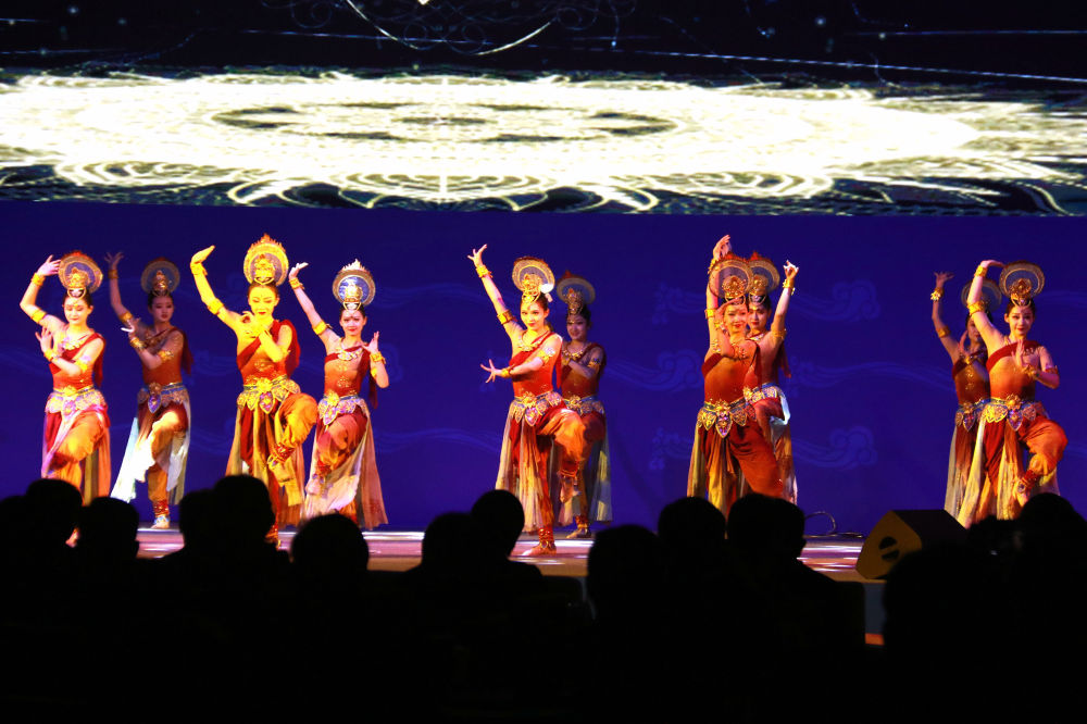 4月9日,演员在文艺演出《敦煌之韵》中表演舞蹈《梵天》。