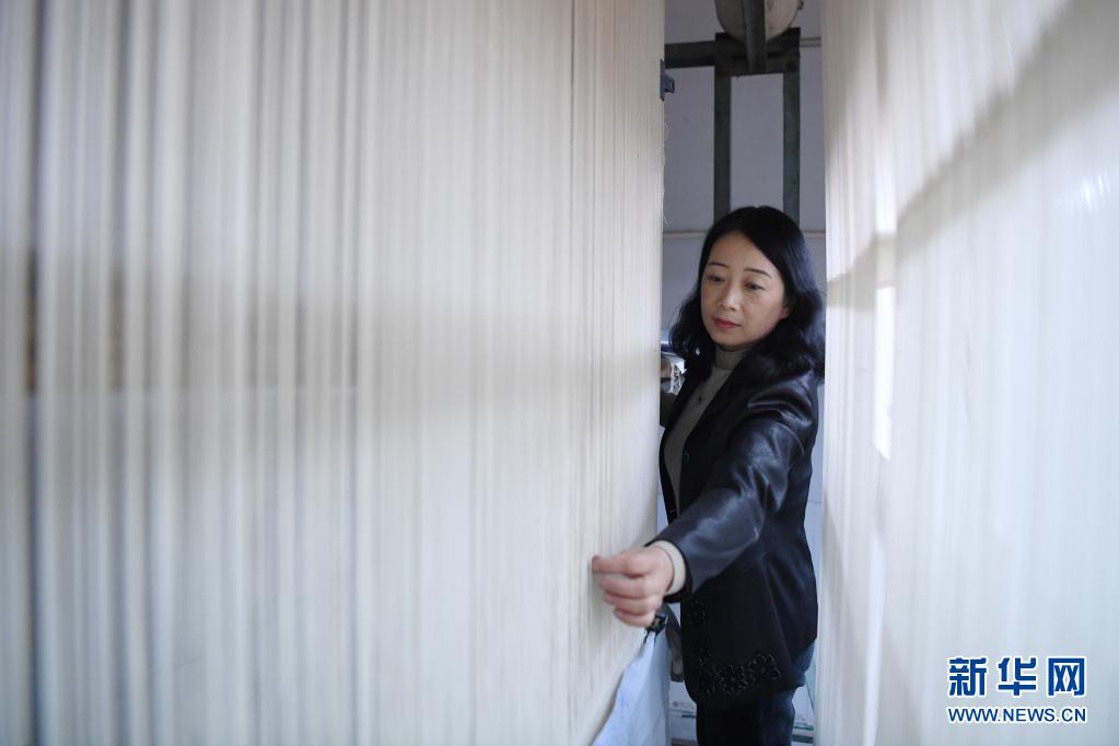 黄晶蓉在天水丝毯织造车间里整理织线(4月12日摄)。新华社记者 陈斌 摄