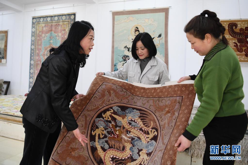 黄晶蓉(左一)在天水新天丝毯有限公司成品展室内和徒弟交流丝毯织造技艺(4月14日摄)。新华社记者 杜哲宇 摄