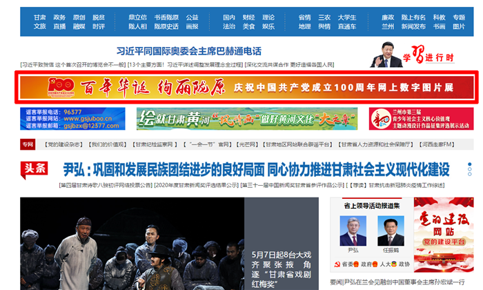 中国甘肃网5月8日讯(本网记者 程健)5月8日上午,“百年华诞·绚丽陇原”庆祝中国共产党成立100周年图片展在甘肃省博物馆正式开展。作为承办单位,中国甘肃网同步上线了网上数字图片展,并在中国甘肃网首页显著位置展示。