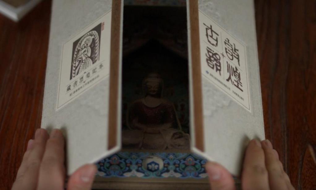 打开《敦煌古韵》象征莫高窟洞窟之门的函盒后,呈现在眼前的是逼真的洞窟造型,四壁和穹顶布满动感的飞天形象。