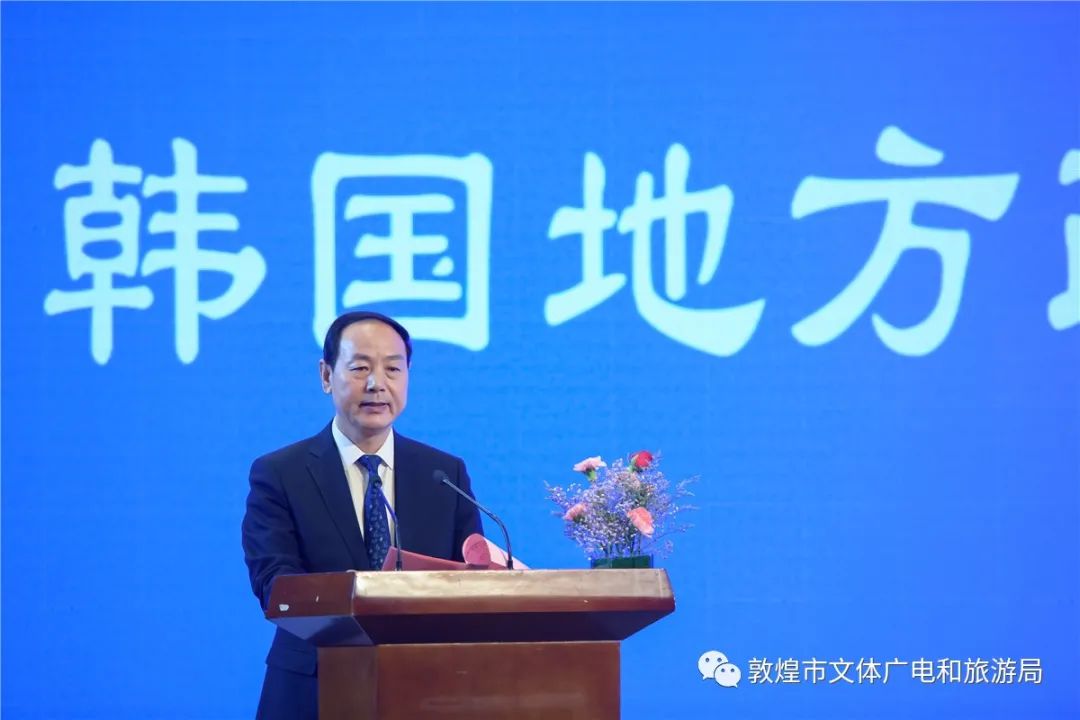 敦煌市委副书记陈国材在推介会上致辞。陈国材副书记向代表们详细介绍了敦煌概况,敦煌文化旅游资源、敦煌在丝绸之路上的历史地位。他在致辞中说,中国和韩国一衣带水,敦煌与韩国城市间的交流也源远流长。去年,敦煌市与韩国顺天市共同成功当选“东亚文化之都”,让我们有幸能够与韩国的朋友们共同在加强东亚国家友好交往、促进人文交流、深化文明交融互鉴等方面开展更多交流合作。我们坚信这次会议必将在深化中韩两国之间的交流合作、增进两国人民友谊等方面发挥积极作用。