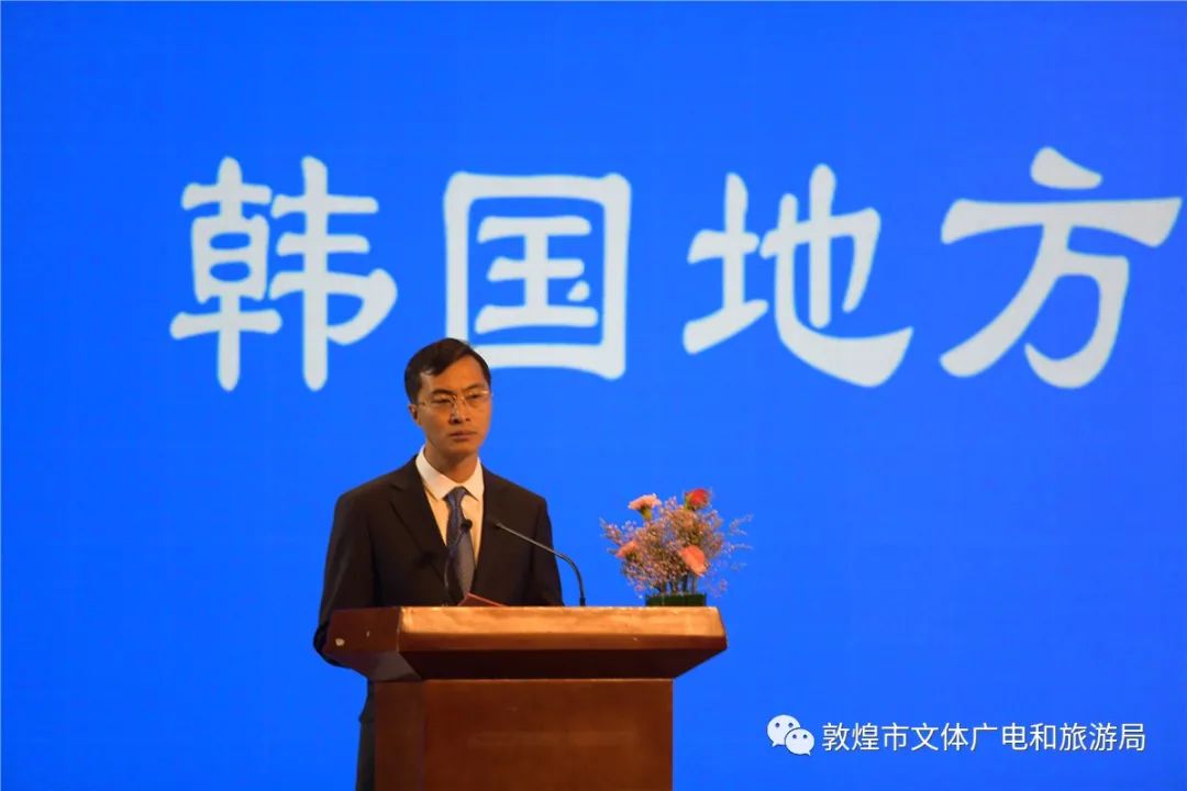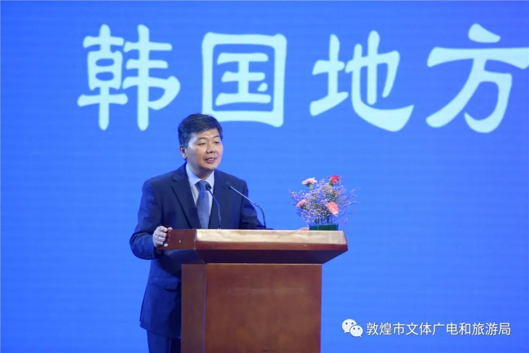 大韩民国市道知事協議會中国事务所所长、大韩民国驻华大使馆参赞金相广在敦煌文化旅游推介会上致辞。金相广在致辞中说,敦煌是丝绸之路上的历史文化名城,敦煌的莫高窟、阳关、玉门关、鸣沙山月牙泉、反弹琵琶城标以及敦煌的美食都让我们印象深刻,难以忘怀。敦煌是一个很有魅力的城市,很多韩国人一生都梦想能够到敦煌来看一看,希望中国敦煌和韩国之间的文化交流更加密切。