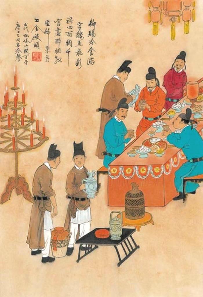 当然了,如此奢华的灯也不是平日所用,应为宴享时放在厅堂里的。所谓宴享,就是主人宴会宾客,也只有在这样重大的场合点亮连枝灯才能烘托出官宦贵族宴会明堂的煌煌大观。我们可以想象,当这一树灯盏点亮后,光焰错落分层,主次呼应,与灯的黄灿灿的铜色相辉映,该是多么的华美悦目,富丽堂皇!