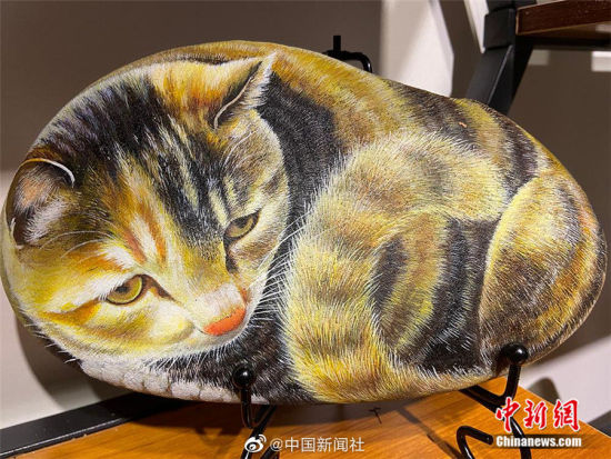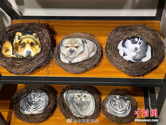 一只只憨态可掬的小猫小狗趴在草窝里,是不是特别惹人怜爱?其实这是兰州市的中小学生们与老师一起创作的黄河奇石立体彩绘。这些作品巧妙利用黄河石特有形态、纹理、进行艺术构思,凭借深厚的绘画功力和天马行空的想象力进行创作。图案中的宠物每根胡须栩栩如生,呆萌的眼神动作与黄河石浑然一体,这也赋予了石头新的生命,让它们“活”了起来。(高展)