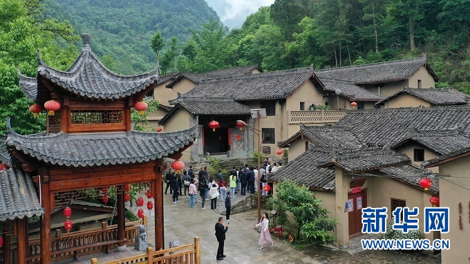 游客在甘肃省陇南市康县岸门口镇朱家沟村参观(5月21日摄,无人机照片)。新华社记者 陈斌 摄