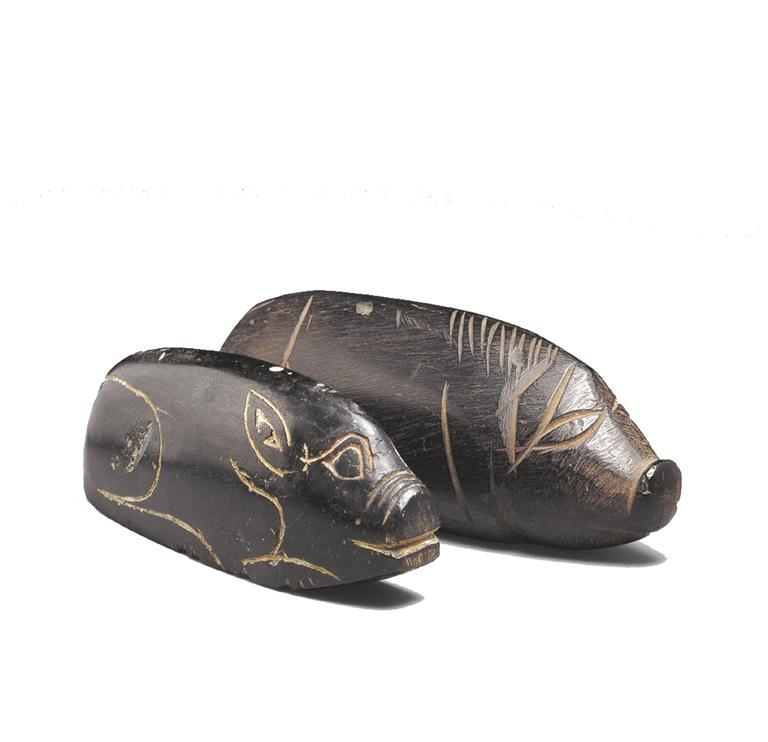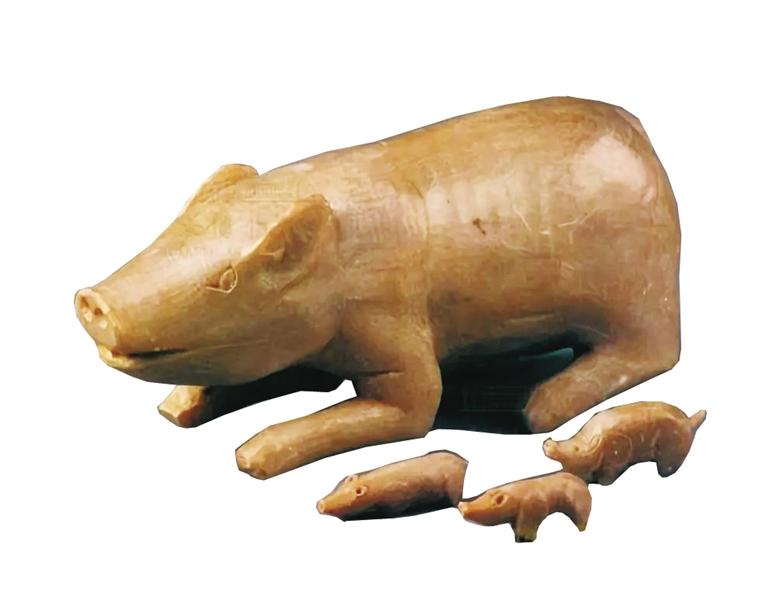 兽牙(以象牙为最贵)、贝壳都是财富的象征,而握以猪的形象出现显然也有这方面的涵义,猪在中国文化中,主要也是财富福气的象征,手握玉猪而逝,寄托着人活一世不空手而去的愿望。