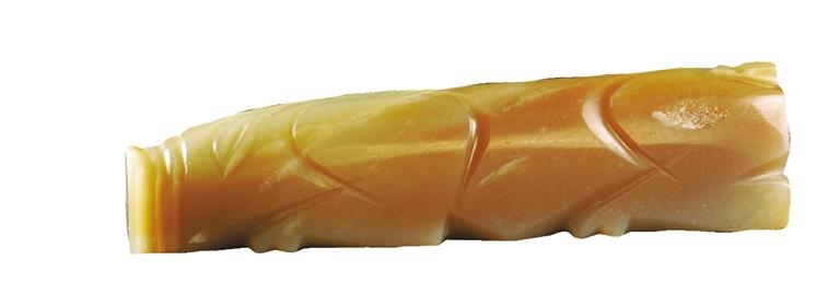 出土于正宁县汉墓的猪形玉握器身为圆棒形,平底,前后两端齐头,器身前部稍低于后部。玉猪眼睛自头顶分向两侧,呈树叶形,器背呈圆棒状,向两侧雕出肩胛和两对腿蹄,四腿均向前伸,作竖卧状,后背末端条形尾上有凹槽,平底上有表示前后腿的刻槽。这只玉握一看就是典型的“汉八刀”雕刻技法,雕琢玉石时用刀干净利落,毫无辅刀的痕迹,刻线似为一面坡形,整体形象大气拙朴,虽简练却神韵俱在。别看这所谓的“汉八刀”的治玉刀工简单,后世的玉雕工匠想模仿都模仿不来呢!即便是模仿了“八刀”的形,也模仿不了“八刀”的韵,这种韵大气拙朴、热情奔放,饱含着旺盛的生命力,就如这猪形玉握,形象远没有那对晋代的炭精猪握雕得逼真,但其形不似却神似,这种神似比之形似给人以更强烈的审美震撼!