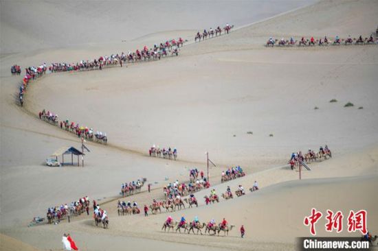 图为今年端午节假期,丝绸之路国际旅游名城甘肃敦煌鸣沙山出现“驼队如龙”景象。 王斌银 摄