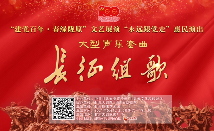 长征是中国革命史上的不朽丰碑,是中华民族的英雄史诗,是人类历史上的伟大壮举。传唱了近半个世纪的《长征组歌》,是生动演绎中国工农红军以血肉之躯谱写伟大胜利的英雄赞歌。该套曲共分为《告别》《突破封锁线》《遵义会议放光辉》《四渡赤水出奇兵》《飞越大渡河》《过雪山草地》《到吴起镇》《祝捷》《报喜》和《大会师》10个部分,以深刻凝炼的语言,优美动人的曲调,浓郁的民族风格和群众喜闻乐见的艺术表演形式,讴歌了中国工农红军在党中央领导下,不屈不挠、无私无畏的革命精神;赞颂了红军指战员艰苦卓绝、英勇奋战的英雄气概;颂扬了中国革命史中具有传奇性的壮丽史诗,气势磅礴,感人肺腑,被誉为我国合唱史上具有里程碑意义的重要作品。在喜迎中国共产党成立100周年、昂首奋进新时代的征程中,在中华民族母亲河畔唱响《长征组歌》,是陇原儿女向党的百年华诞最深情的表白。