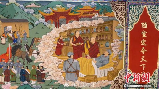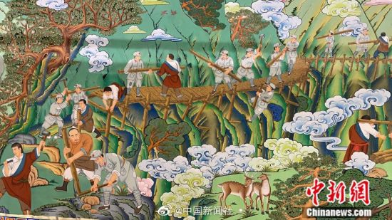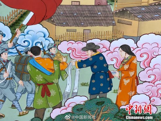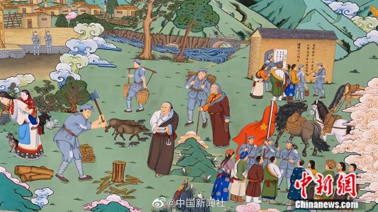 近日,由来自全国各地70多位唐卡画师历时近一年创作的巨幅唐卡已基本完成。主题为《红军长征过甘南》唐卡长111米,描绘的内容涉及俄界会议、腊子口战役、崔谷仓放粮、洮州会议等十一个甘肃甘南红色故事。唐卡色彩明快大气,绘画使用的颜料取材于金、银、珍珠、玛瑙等珍贵矿物宝石,画面散发出的恢弘气息令人赞叹。(卓玛)