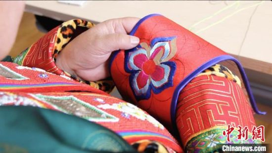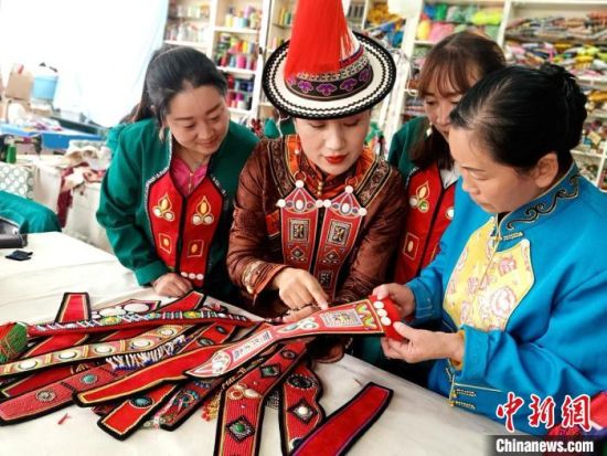 图为裕固族服饰非遗传承人(左二)教授裕固族农牧民服饰刺绣。 史静静 摄