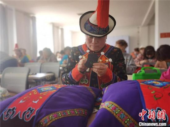图为裕固族服饰非遗传承人为学员传授传统服饰刺绣。 史静静 摄