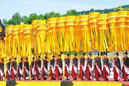 走进公祭伏羲大典的祭祀典礼广场,寓意着中华儿女龙凤呈祥的幡旗迎风招展,特制的钟、鼓屹立在广场一侧。广场正中央,公祭伏羲大典丰碑庄重而宏伟。参加祭祀的代表及嘉宾肃然而立,等待着典礼开始。