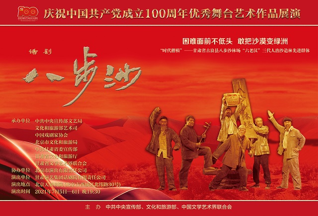 在举国上下热烈庆祝中国共产党成立100周年之际,由中共中央宣传部、文化和旅游部、中国文学艺术界联合会主办,中共中央宣传部文艺局、文化和旅游部艺术司、中国戏剧家协会、北京市文化和旅游局、中共甘肃省委宣传部、甘肃省文化和旅游厅、甘肃省文学艺术界联合会承办,甘肃演艺集团话剧院创排的话剧《八步沙》,作为庆祝中国共产党成立100周年晋京展演剧目,将于7月5日至6日晚在北京天桥剧场隆重上演。