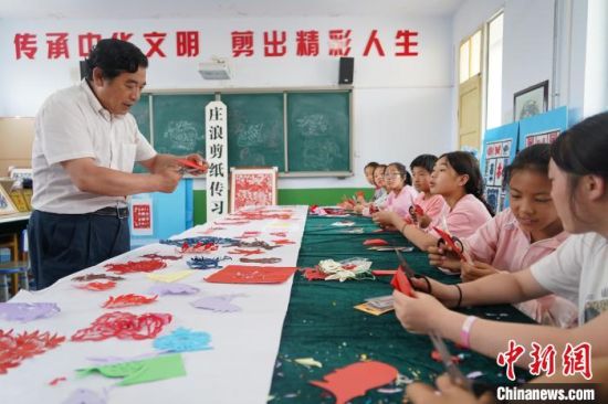 图为剪纸传承人李敏贤给中学生上剪纸教学课。(资料图)李顺民 摄