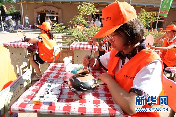 7月20日,在临洮县中小学生陶艺创作大赛决赛现场,孩子们正在绘制彩陶。新华社记者 文静 摄