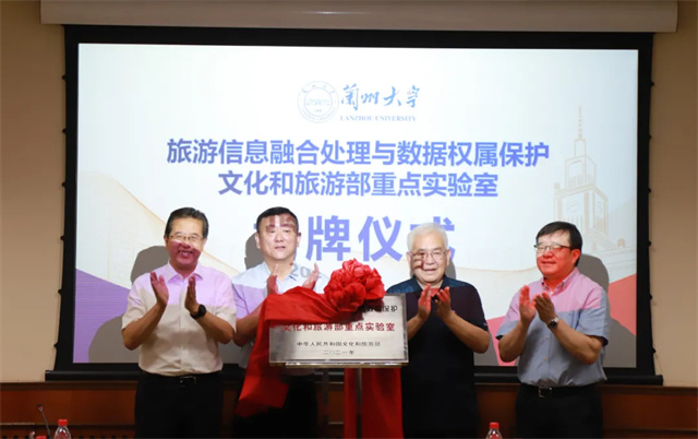 7月31日上午,旅游信息融合处理与数据权属保护文化和旅游部重点实验室揭牌仪式在兰州大学举行。兰州大学党委副书记、副校长徐生诚,文化和旅游部科技教育司二级巡视员张岩,省文化和旅游厅党组书记、厅长陈卫中,中国工程院院士、清华大学教授郑纬民分别致辞并共同为重点实验室揭牌。省文旅厅党组成员、副厅长万学科参加揭牌仪式,兰州大学信息科学与工程学院院长任丰原主持揭牌仪式。