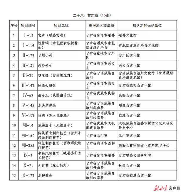 甘肃省此次入选第五批国家级非物质文化遗产代表性项目的15个项目,也分别有了保护单位,分别为甘州区文化馆、两当县文化馆、陇西县文化馆、玛曲县文化馆、临潭县文化馆、西和县非物质文化遗产保护中心、临潭县文化馆、岷县文化馆、肃北蒙古族自治县文化馆、甘南藏族自治州文化馆(甘南藏族自治州美术馆)、民勤县文化馆、天祝藏族自治县华锐文化艺术研究开发中心、兰州市文化馆、岷县当归研究院、舟曲县文化馆。(文/新甘肃·甘肃日报记者 施秀萍)