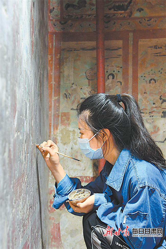 在他身旁,去年4月刚刚入职的赵一君,正用学画的手拿着细针一样的工具修复着地仗层的一处残破。