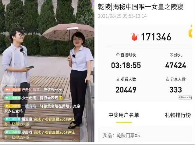 在第五届丝绸之路(敦煌)国际文化博览会和第十届敦煌行·丝绸之路国际旅游节开幕前夕,由丝绸之路旅游推广联盟秘书处(甘肃省文化和旅游厅)联合马蜂窝旅游网共同举办的“云游丝绸之路”线上互动直播活动第二场于8月29日走进乾陵,通过主播和资深讲解员幽默、风趣、专业的解读,带着大家穿越千年丝路,感受大唐盛世,品味中华文化,引发观众一直好评,直播热度高达17.1万。