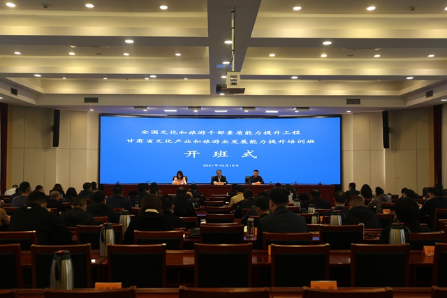 为认真贯彻习近平总书记对甘肃重要讲话和指示精神,全面落实党中央、国务院、省委、省政府关于统筹推进文化事业、文化产业和旅游业发展的部署,加强文旅产业(企业)合作交流,提升文化旅游产业发展整体能力水平,10月10日,由甘肃省文化和旅游厅主办,中央文化和旅游管理干部学院承办的全国文化和旅游干部素质能力提升工程——甘肃省文化产业和旅游业发展能力提升培训班在中央文化和旅游管理干部学院开班。甘肃省文化和旅游厅二级巡视员、产业发展处处长陈海涛作开班动员讲话,中央文化和旅游管理干部学院副院长陈锋在开班仪式上致辞,中央文化和旅游管理干部学院产业培训部主要负责人主持培训班开班仪式。