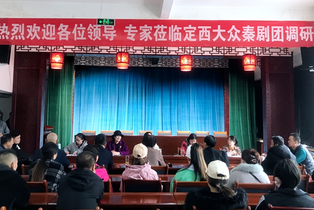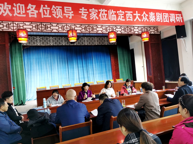 此次调研活动主要围绕甘肃民营院团机构数、院团类型、从业人数、人员构成、经营状况、运营模式、演出剧目、新创剧目、收入情况等现状以及发展较好的民营艺术表演团体管理与实践经验,存在的问题与未来发展规划等方面,以召开座谈会、赴实地考察、采访民营院团主要负责人和演职人员以及观看演出等形式展开。在梅花奖演员佟红梅创建的民营演艺团体梅馨公司调研时,主要对梅馨公司的市场运作模式、戏曲创作及演出、演出场所进行采访和现场考察。在近年来发展迅速的定西市大众秦剧团调研时,以座谈会的形式,与定西市文体广电和旅游局、安定区文体广电和旅游局相关领导和艺术科相关人员、定西市大众秦剧团全体演职人员,就定西市民营剧团现状与发展情况,以及定西市政府和主管部门对本市民营院团的支持政策等进行深入交流;观看了由大众秦剧团表演的秦腔折子戏《挑袍》《断桥》《辕门斩子》三出剧目,实地考察院团演出的受众面和观众构成情况。在对通渭县民营团体的调研中,调研组一行主要通过观看由通渭县襄南金牛演艺公司表演的皮影戏《火化金梅寺》,通渭县雅玉星乐演艺公司表演的曲子戏《下四川》《牧牛》《苏三起解》等剧目,以及面对面采访民间艺人等形式,对承担国家级非物质文化遗产代表性项目传承传播的农村民营表演团体进行了全面调研。