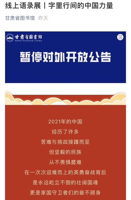 坚持服务初心不变。按照疫情防控工作有关要求,为减少人群聚集性活动,全省叫停或关停了部分公共图书馆、文化馆(站)等公共服务场馆,停止线下服务。但是,闭馆并未停止公共文化服务。各级公共图书馆、文化馆(站)把服务阵地由线下转到线上,持续丰富群众精神文化生活。虽然服务阵地有所转换,但是甘肃文旅人服务群众的初心不变,坚持做到闭馆不闭网、服务不打烊。