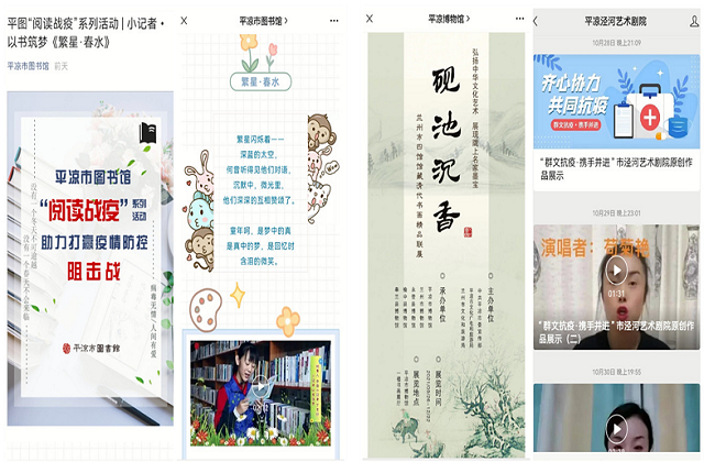 平凉市文化广电和旅游局整合泾河艺术剧院的泾河大戏台、市文化馆的文化大舞台、市博物馆的线上博物馆、市图书馆的线上图书馆、微游平凉的网上看平凉等五大平台,连续推出线上文旅战“疫”专题栏目,丰富公众精神文化生活,向外界持续推介多彩平凉。