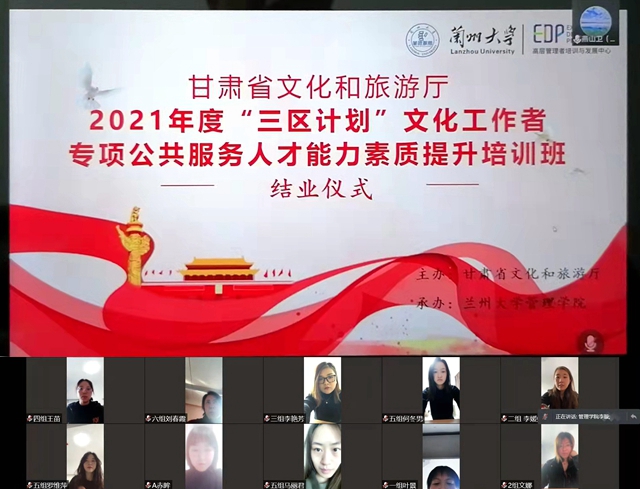 11月16日上午,甘肃省“三区”公共服务人才培训班以视频会议形式,在兰州举行专业技能培训阶段结业会。兰州大学管理学院有关领导参加了结业式。
