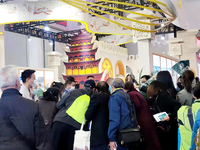 11月27日,飞天舞蹈在甘肃展馆翩翩起舞,前来参观的游客络绎不绝,大家一边拿着手机在线直播,一边争相合影打卡。“一见倾心,这个展馆就是一座文化殿堂、一个旅游景区,置身其中,仿佛真的来到了甘肃。”刚刚参观过甘肃展馆的武汉市民张先生激动地说。