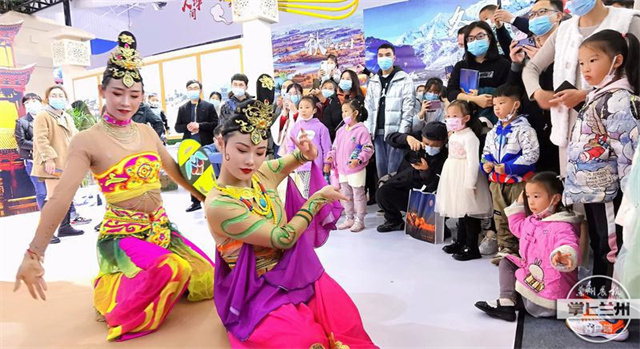 “我要和飞天姐姐跳敦煌舞……”展馆中身着飞天服饰的伎乐飞天小姐姐们翩翩起舞,柔美婀娜的舞姿,如同从莫高壁画中走出一般,与展馆的整体风格融为一体。热情兴奋的观众将展馆围得水泄不通,争相拍照留念,一群随着家长前来的小朋友欣赏着“飞天小姐姐”的精彩表演,还瞬间启动“舞蹈模式”,手舞足蹈地学着“飞天小姐姐”跳起了敦煌舞,认真的眼神、萌萌的表情、略显“笨拙”的姿势,赢得了观众们的笑声和掌声。(文/图 掌上兰州·兰州晨报记者 杨亮 通讯员 陆谨)