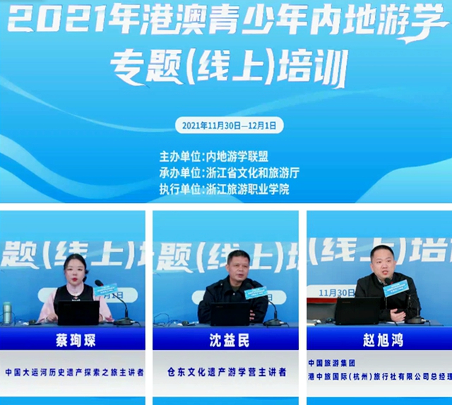 为进一步提升港澳青少年内地游学联盟成员单位政策理论水平和业务素质能力,由文化和旅游部港澳台办公室(国际交流与合作局)指导,港澳青少年内地游学联盟主办,浙江省文化和旅游厅承办,浙江旅游职业学院执行的2021港澳青少年内地游学专题(线上)培训班于11月30至12月1日举行。甘肃省文化和旅游厅组织省内主做港澳游学市场的文化旅游企业在线参加了本次培训。